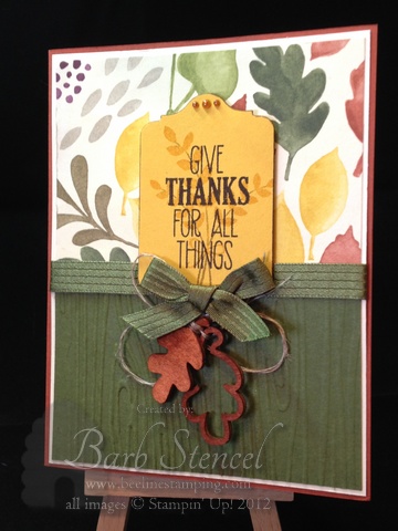 Do you recognize the background I used on this card? Didn’t think so… Its actually the ‘Thanks’ stamp from Seasonally Scattered. I inked it with Hello Honey, then took my Blackberry Bliss, Cajun Craze and Old Olive markers and “Thumped” them on top of the Hello Honey before stamping. Cool, eh?